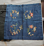 This cloth has curling floral stems in each quadrant that are rendered through embroidery and resist dying. The colorful blooms and leaves are depicted through careful stitching of multihued and metallic threads. The grey flowers and leaves are made from resist dying and ink painting.