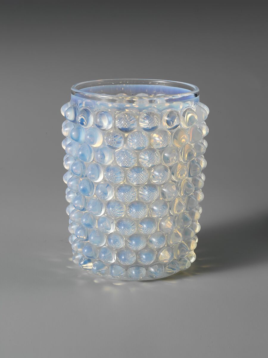 This piece is pressed in the "hobnail" or "opalescent dewdrop" pattern.