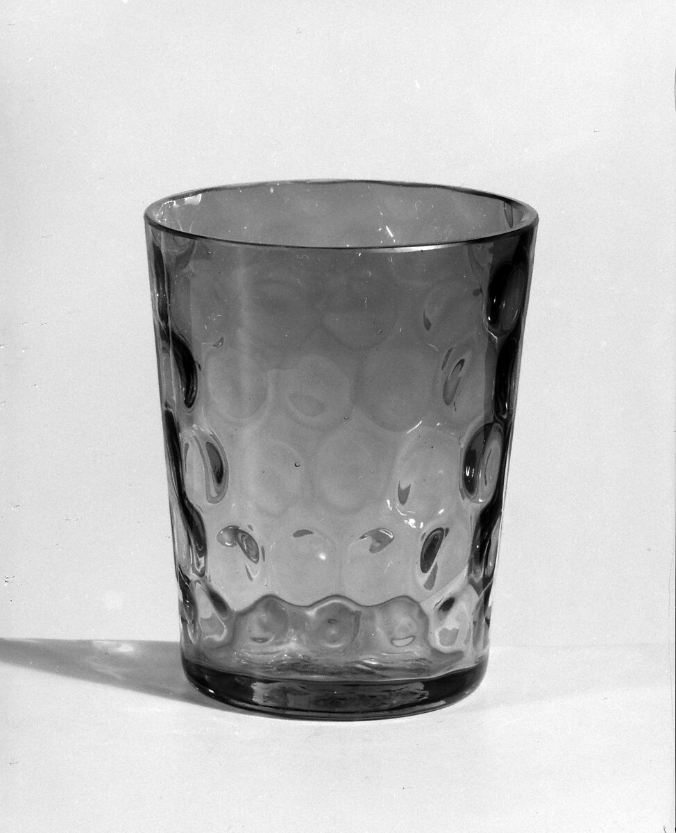 This tumbler, decorated with the "inverted thumbprint" pattern and "sunburst" pattern on the bottom, has been attributed to the West Virginia firm of Hobbs, Brockunier and Company. By 1879, this was one of the largest glass factories in the United States.