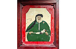 Both the image of the bird and the Arabic inscription on this suwer (or souwere, Wolof for reverse glass painting) reveal it as a portrait of Seydina Mandione Laye, caliph of the Layeniyya Sufi brotherhood in 1949–1971. Seemingly inspired by a photograph, this suwer is one of the earliest known depicting this spiritual leader with the bird that is associated with his spiritual election since 1950, when it wondrously sat on his shoulder during prayer. Evoking a topical moment in the history of the Layeniyya, a community that is particularly attentive to supernatural events, the image of the Phaeton has since become a symbol of this brotherhood.