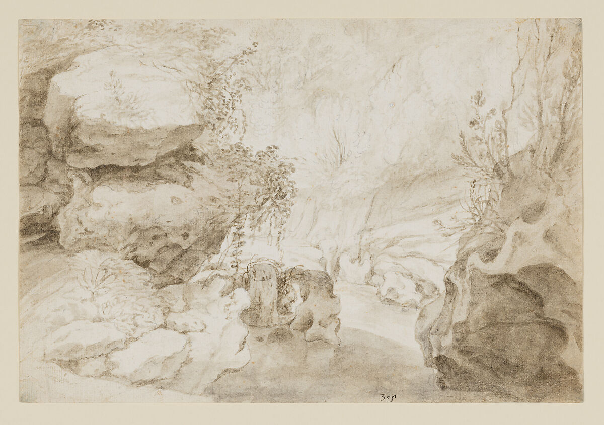 Previously confused with Karel Dujardin, Guilliam du Gardijn is now understood as an important practitioner of Italianate landscape drawings in the seventeenth-century Dutch Republic. This lyrical, atmospheric sheet was likely made in or around Rome, where the artist is believed to have traveled in the 1620s or 1630s. Working with a half-dry brush, the artist skillfully conjured the molten forms of the overgrown rocks and the gentle luminosity of the sun filtering through the trees and reflecting on the water. Inscribed on the lower edge of the recto, in dark brown ink, is a price: 30 St [stuivers]. Similar inscriptions appear on several drawings by Du Gardijn, though whether they record the prices of the drawings at hand is not certain.