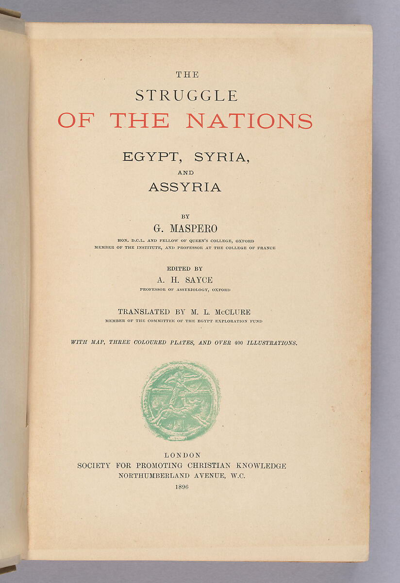 Gaston Maspero was perhaps of the most famous Egyptologist of his generation. That his grand three-volume history of the ancient Near East, Histoire ancienne des peuples de l’Orient classique (Paris, 1895–1897), was translated into English for the Society for Promoting Christian Knowledge, highlights both the intersection of religious and educational interests in the Society and the degree to which the history of West Asia was seen through the lens of the Bible in nineteenth-century England. The series consists of three volumes: The Dawn of Civilization: Egypt and Chaldea; The Struggle of the Nations: Egypt, Syria and Assyria; and The Passing of the Empires 850-330 BC.