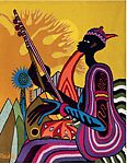 Le koriste depicts a kora player, a figure deeply connected to Senegalese cultural heritage. Unlike many tapestries created at the Manufactures Sénégalaises des arts décoratifs de Thiès which featured jazz musicians, Goudiaby grounds his subject in local traditions, emphasizing the importance of the kora in contemporary Senegalese identity. The representation of a baobab tree, a national symbol of Senegal, further anchors the artwork in its local context.