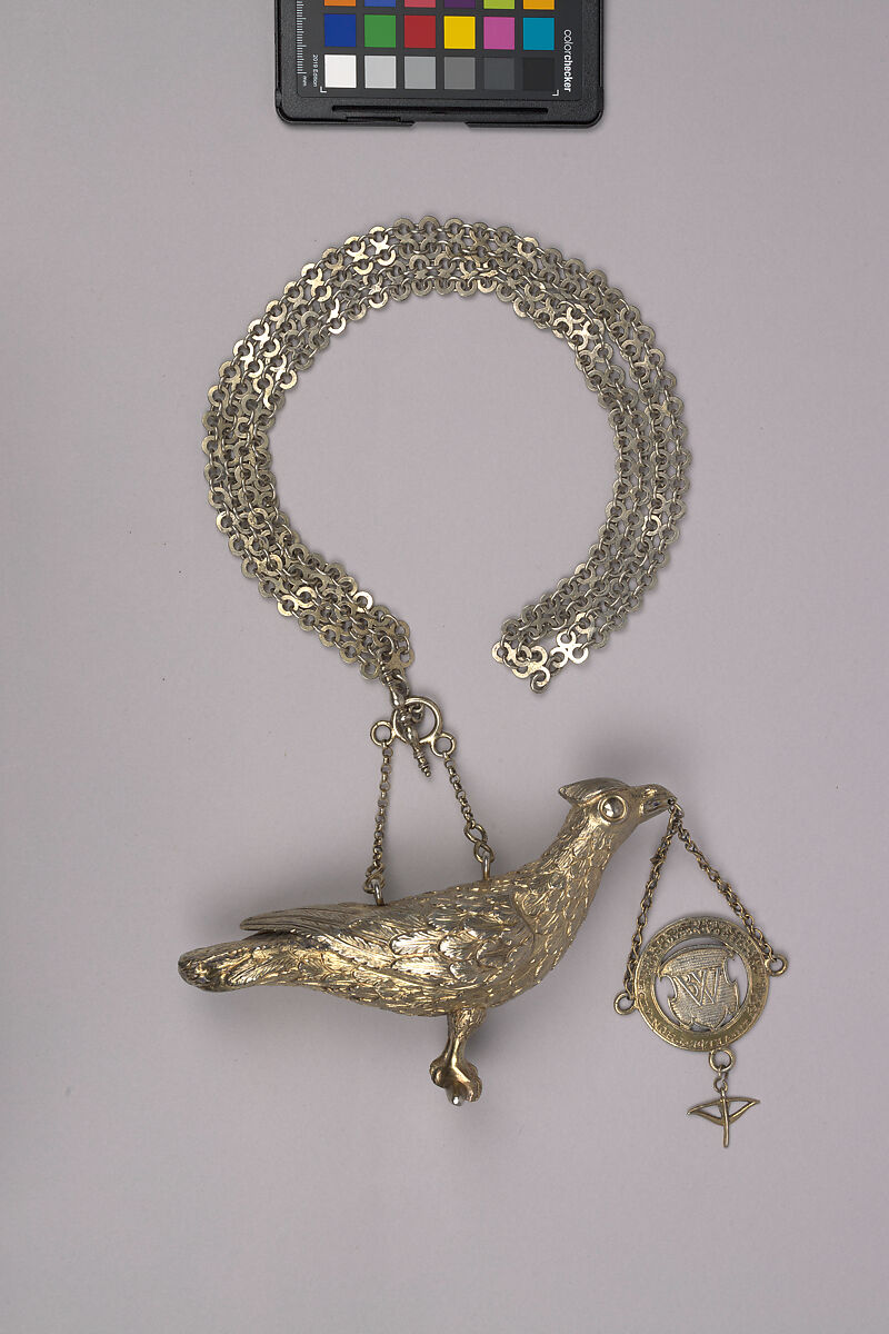 Designed to hang from a chain, this wearable trophy was granted to the winner of a shooting competition in the late sixteenth century. Schützenvögel or “shooting birds” were a popular form for this type of prize. Crafted from precious metals, they made appealing awards which commemorated the athletic prowess of a victorious archer or rifleman and were often reused, year to year. Community events, like shooting contests, certainly provided entertainment, but were also opportunities to increase social cohesion.