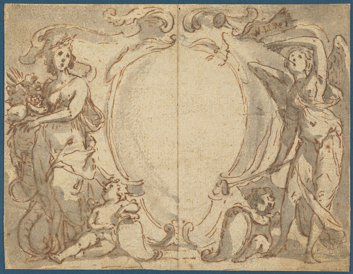 This drawing exhibits a confident and accomplished hand that can be placed within the circle of Abraham Bloemaert. Its inscription, seemingly rendered in the same brown ink as the rest of the drawing, reads "VV [Vive] le roi," a phrase that became especially popular during the reigns of the French kings Henri IV (1572-1610) and Louis XIII (1610-1643). The drawing was presumably intended as a design for a print (possibly but not certainly a frontispiece) featuring a portrait of one of these monarchs within the cartouche, on either side of which appear personifications of Abundance and Fame. Although no such print has yet been identified, similar pictorial language appears in a 1626 portrait of Louis XIII by Crispijn de Passe I after Rubens. The sheet may well date to the period after 1617, when Louis XIII exiled his mother, Marie de Medici, thus ending her regency and marking his assumption of power.