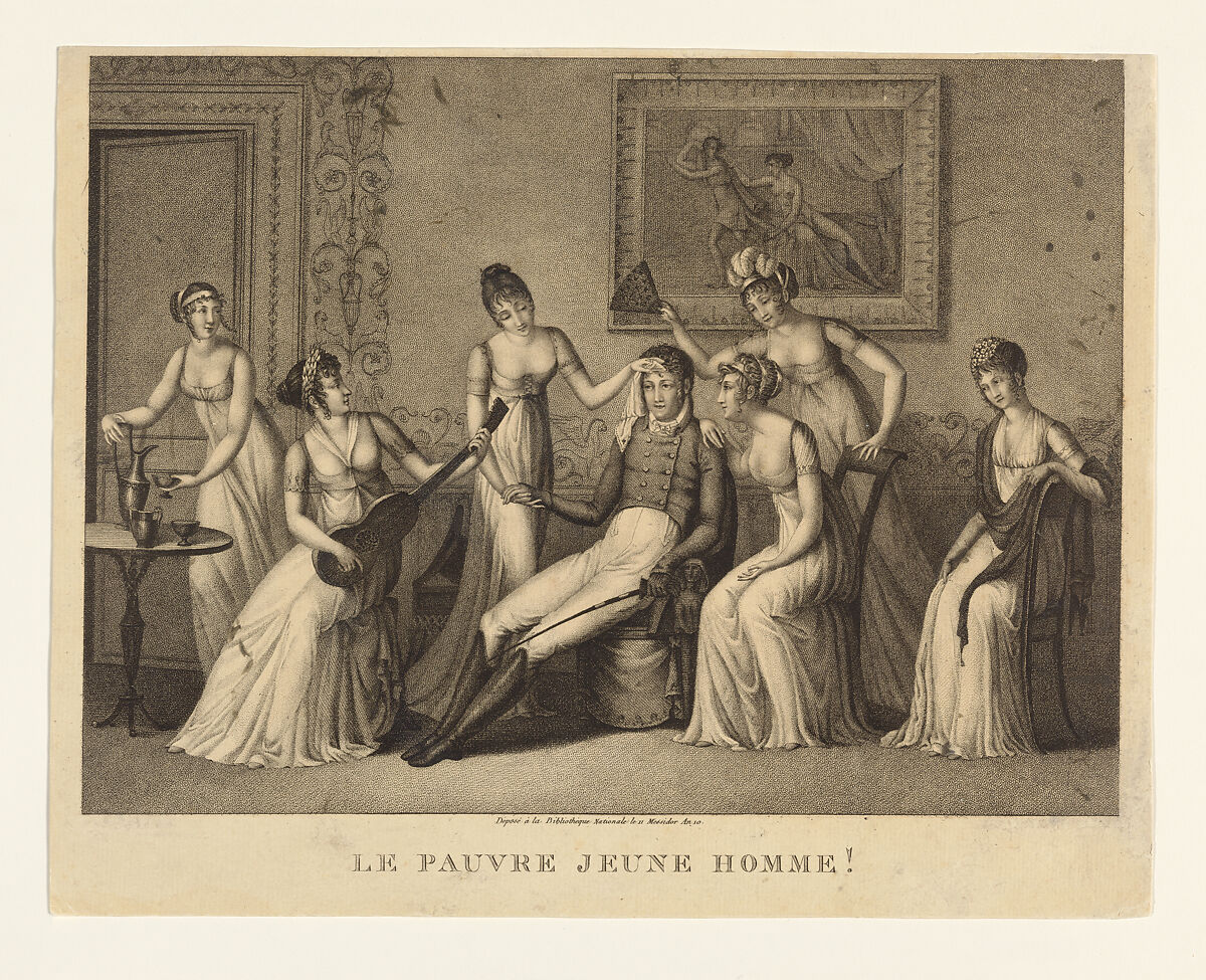 In this print and its pair (see 37.68.22), Lingée depicted scenes of romantic pursuit. In Quel est le plus heureux? (37.68.22) a woman in a fashionable thin white gown sits amid male suitors who pursue her with notes slipped into her hand, kisses, and sneaky glances. Unlike the overwhelmed woman, in the print here, a man is unfazed by the women who fawn over him. Artwork that decorates both settings reminds viewers of the dangers of lust, depicting the stories of Susanna and the Elders, Lucretia, and Joseph and Potiphar’s wife. Divorce was legalized during the French Revolution, in 1792, granting women greater control in romantic relationships, but Napoleon would restrict it in 1803. The subtle differences between these two scenes point to the gendered power imbalances of love in Napoleonic France.
