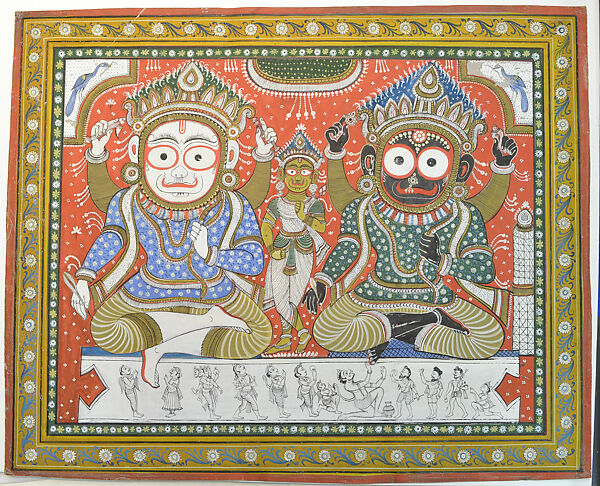 This charming painting depicts the ruler of Orchha, Prithvi Singh (r. 1735–52), engaged in pious worship of lord Krishna in his flute-playing guise of Venugopala. Krishna stands alert, his side-flute held to his lips as he engages his devotee in a sideward gaze. The raja, who stands reverently before his private shrine, offering lotus in his pressed hands, appears mesmerized by the sweet sounds of Krishna’s flute. Krishna Venugopala stands in a pavilion with a Mughal-style floral mural dado and a gilded orange blind, here drawn up. The blue god stands on a gilded stool cushioned with a bed of lotus petals, and ritual utensils are arranged around and before him.