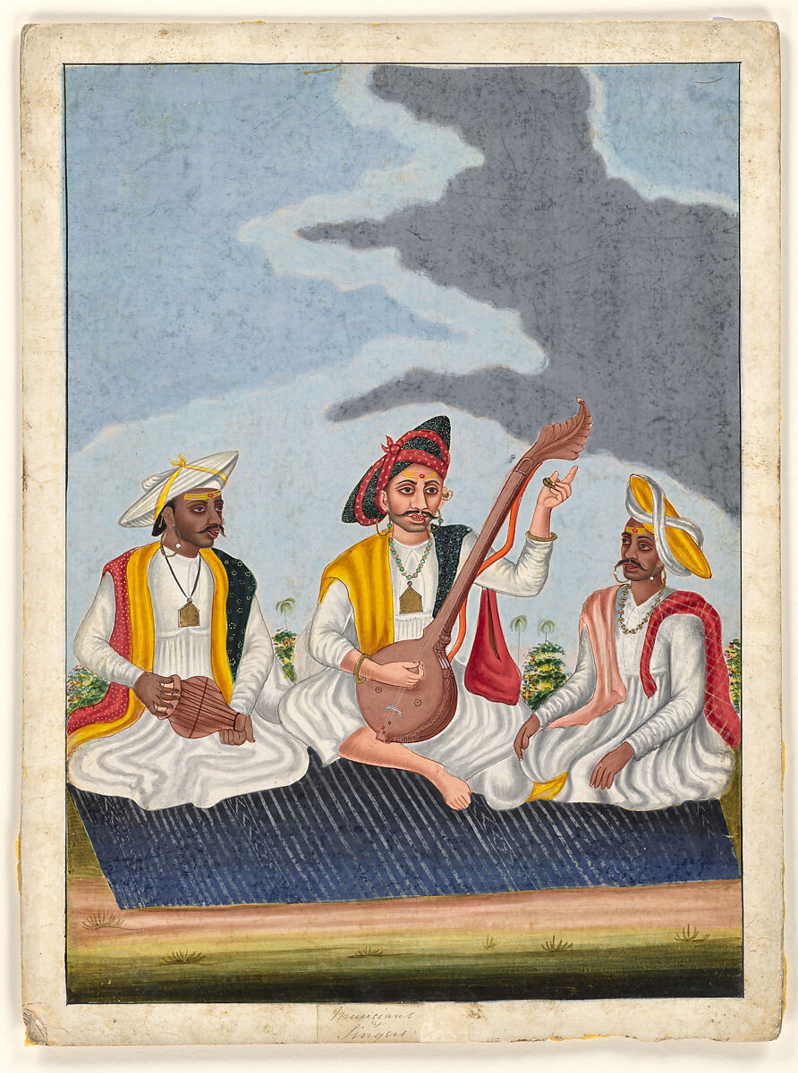 This lively painting of three itinerant musicians performing in an open landscape was produced in Thanjavur, which in the late 18th century was the center of the Nayaka culture. They are readily identifiable as being of Maratha-descent by the distinctive broad turbans (pheta) that they wear. Each sports an extravagant moustache and wears large earrings set with a pearl or gemstone. Triple horizontal forehead marks with a red tilak dot indicates their sectarian allegiance as devotees of Shiva.