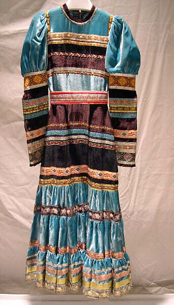 Giorgio di Sant’Angelo began his career in fashion with designs for plastic jewelry in the late 1960s. Early examples were featured in Vogue magazine under editor, Diana Vreeland and earned Sant’Angelo a Coty Award in 1968. His first clothing collections were inspired by traditional Romany and Native American dress and reflected the multicultural and do-it-yourself aesthetics of the hippie movement. The designs, which rejected the strictly tailored forms of the previous decade, featured natural silhouettes achieved through wrapping, layering, and tying fabric around the body. They earned the designer his second Coty Award in 1970. Sant’Angelo’s popularity waned along with the mode for eclecticism and fantasy in the early 1980s. He returned to favor in the late 80s with designs for wrapped, body conscious garments in brightly-colored silk stretch gauze.