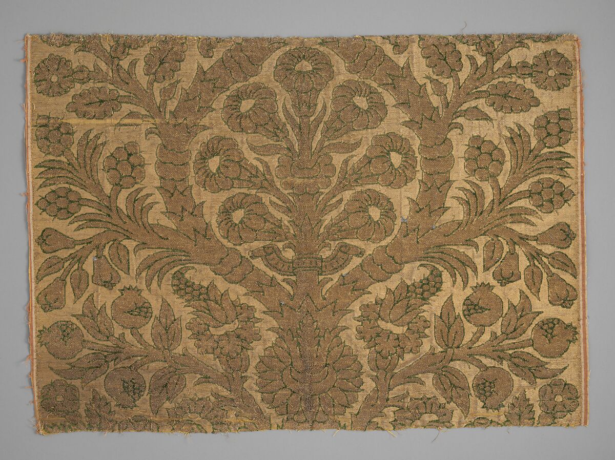 The stylized floral design of this textile is delineated by fine lines of green silk velvet; the rest of the surface is covered with gold metal-wrapped threads, lying flat in the background and forming loops in the plant forms. The large flowering plant in the center and the vine that surrounds it can be identified as Sempervivum tectorum (now commonly known as "hens and chicks"), a species of hardy succulent that has the ability to thrive in extreme mountainous conditions. Recent research has revealed that this plant motif was associated with the Sforza family of Milan starting in the mid-fifteenth century. Variations on this pattern were also produced as monochrome pile-on-pile silk velvets and the Museum has red and green examples.