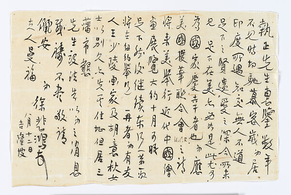 The current letter relates closely to another series of letters written by Xu in The Met Collection; see his Seventeen letters (2005.509.12). While Xu’s dream of mounting exhibitions of modern Chinese painting in the United States was ultimately realized, including an inaugural exhibition organized by the Metropolitan Museum in 1943, Xu himself was never able to travel to this country.