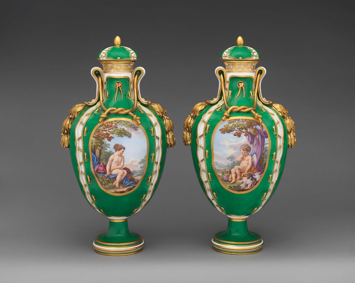 The curious form of these vases was inspired by pilgrim flasks made of leather-encase gourds intended for carrying water. The modeling realistically creates the impression of cut leather panels laced together, enclosing an inner container. The painted decoration makes no reference, however, to the function of the pilgrim flasks; the figures of Cupid and Psyche are based on popular sculptures by Etienne-Maurice Falconet (1716–1791).