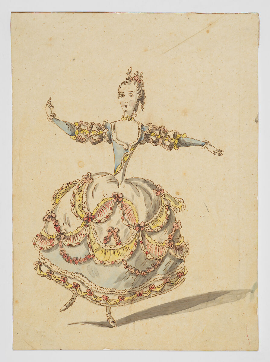 The French artists Louis René Boquet was a prolific stage and costume designer. In 1758, he became the successor to Jean-Baptiste Martin as principal designer of the Paris Opera, but he also designed more widely for the French court under both Kings Louis XV and King Louis XVI. These two costume designs - one in blue and white with yellow and pink accents consisting of ribbons and bows, and the other fully white with pink flower garlands - were intended for ballets or operas. Similar designs to the white dress are preserved at the Bibliotheque de l'Opera Garnier and there identified as "Suivant/Suivantes de l'Himen" (followers or attendants of Himen) from the tragédie lyrique "Ismène et Isménias, ou La Fête de Jupiter" (Ismène and Isménias, or The Festival of Jupiter). It was first performed in 1763 for King Louis XV at Château de Choisy and later also at Fontainebleau and Versailles, but restaged for the public at the Opera, starting in December of 1770. Our design likely relates to this later staging of the tragedy. Boquet's surviving oeuvre further indicates that designs circulated in his workshop in multiple versions, with different drawings serving distinct functions. For example, another drawing by Boquet in the Museum's collection is heavily annotated with details about the fabrics and colors to be used in the design, while the present sheets offer a clean overview of the costume.