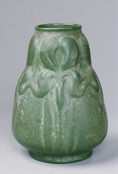According to family tradition, Dard Hunter made this glazed earthenware vase with relief decoration of the stems, leaves, and flowers of irises for Elbert Hubbard's daughter, Miriam. The vase’s matte green glaze was one favored by other American art potteries, notably the Grueby Pottery and the American Terra Cotta and Ceramic Company. Although primarily a book designer and paper maker, Hunter worked in other media including ceramics, stained glass, and metal. Hunter worked in ceramics while at Roycroft from 1903–10, the arts and crafts community and business founded by Elbert Hubbard in 1895. For additional examples of Hunter's ceramic work in porcelain and earthenware see 1982.311.1–.4, and .6.