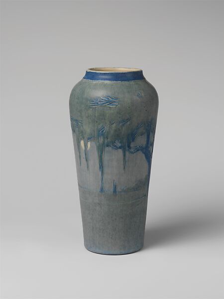 Joseph Fortune Meyer was Newcomb's "master potter" who not only made the pots, but also experimented with new glaze techniques. Meyer received a medal for his work at the St. Louis Exposition in 1904. Sadie Irvine, the decorator of this vase, graduated from Newcomb College in 1906 and worked at the pottery as a decorator, craftsman, instructor, and finally, as head of the pottery department. The soft green and blue matte glaze, and stylized landscape of trees draped with Spanish moss with the moon visible under the branches, is characteristic of Newcomb's later pieces. For other examples of Newcomb Pottery in the Museum, see: 1983.26, 67.84.1, and L.1982.137.2.