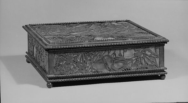 This box, in the "Etched Metal and Glass" pattern, forms part of a nineteen-piece desk set made by Tiffany Studios of New York.