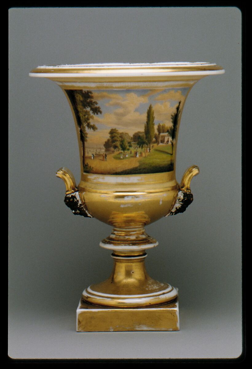 This vase is part of a pair that feature two views of the New York City region copied from a portfolio of prints entitled "Views in New York and Its Environs" (1831–34). This vase, shows lower Manhattan seen from the East River side of Governor's Island. The other (17.144.1) entitled "Elysian Fields, Hoboken," portrays a New Jersey park located directly opposite New York City that became a popular spot in the early nineteenth century.