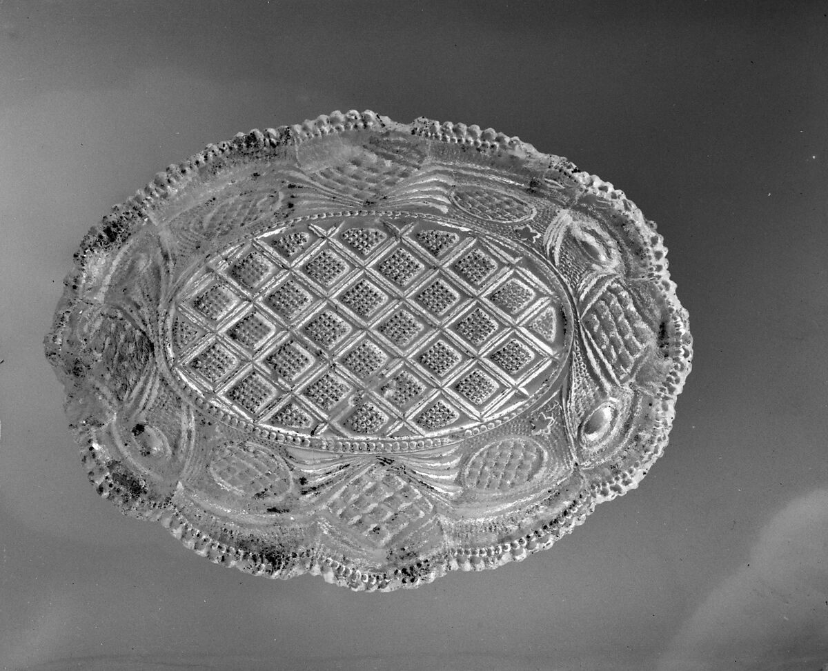 This vegetable dish is pressed with a crossed peacock feather pattern on the sides and a waffle design in the center.