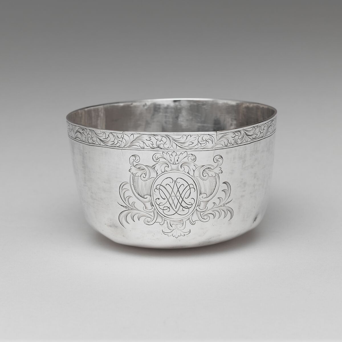 This broad-lipped tumbler, with its lovely engraved cartouche and scrolled acanthus-leaf ornament, was made for Samuel (1669–1698) and Adriantje Bayard (b. 1667) Verplanck, probably on the occasion of their marriage in 1691. The couple’s intertwined reverse cipher, “SAVP” is engraved on one side within the scroll and leaf cartouche, and their initials, “P” over “S V A”, are engraved in shaded roman lettering on the underside. Although unmarked, this vessel was likely made by a silversmith working in either New York or Albany.