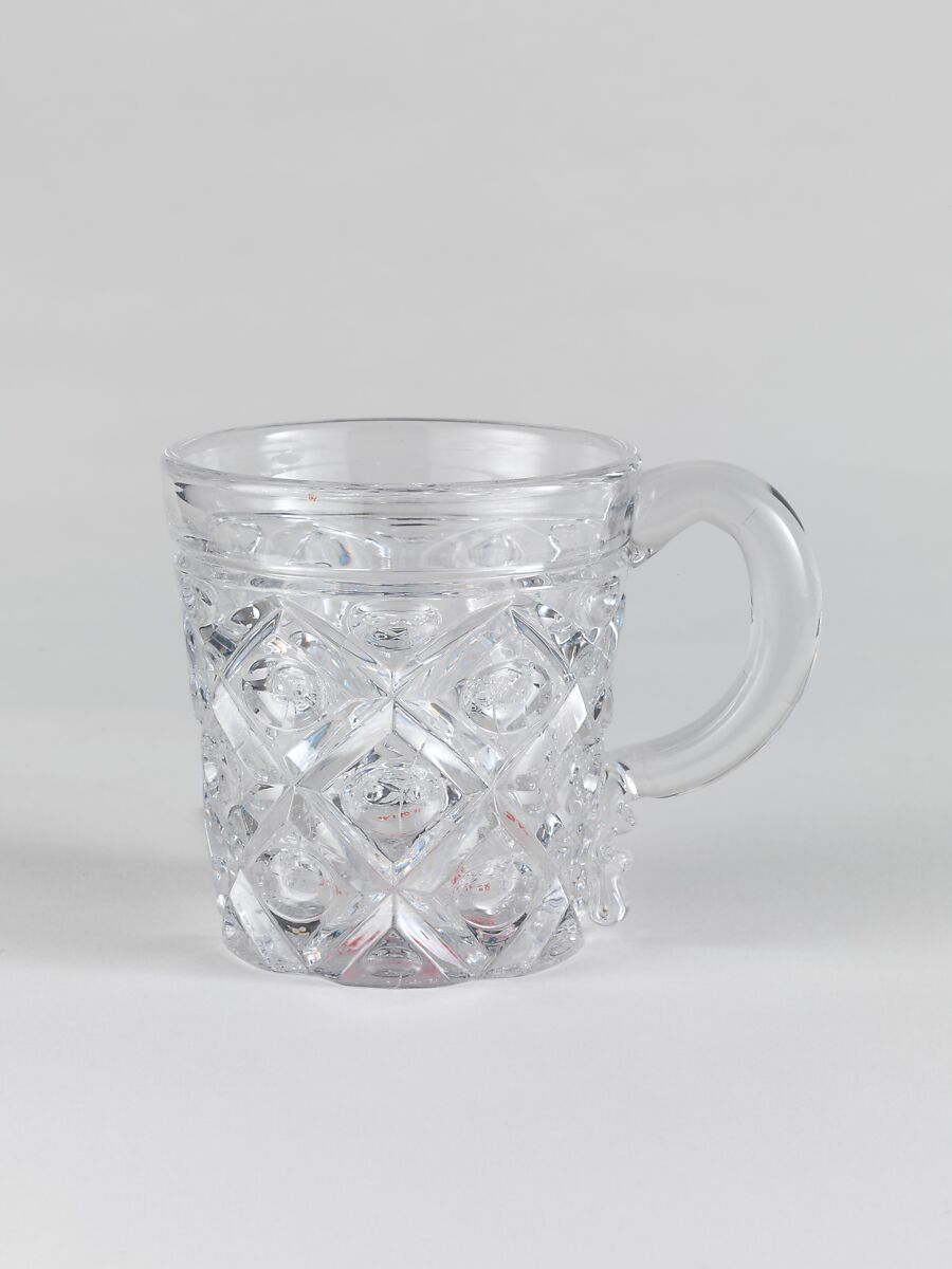 With the development of new formulas and techniques, glass-pressing technology had improved markedly by the late 1840s. By this time, pressed tablewares were being produced in large matching sets and innumerable forms. During the mid-1850s, colorless glass and simple geometric patterns dominated. Catering to the demand for moderately-priced dining wares, the glass industry in the United States expanded widely, and numerous factories supplied less expensive pressed glassware to the growing market. At the Exhibition of the Industry of All Nations at New York’s Crystal Palace in 1853, for example, the New England Glass Company exhibited 130 pieces of one design, "consisting of bowls, tumblers, champagnes, wines, and jelly glasses." This object belongs to one such service. Although the glass manufactory is not known, the glassware is very typical of the large services that were very popular with America’s middle class in the nineteenth century.