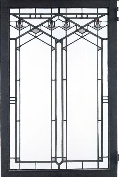 This window was made for the home of B. Harley Bradley in Kankakee, Illinois. The triangular forms of the linear cames, or rods, repeat the Japanese gables found in the roof. These windows are early examples of the complex geometric patterning which characterized Frank Lloyd Wright's later work.