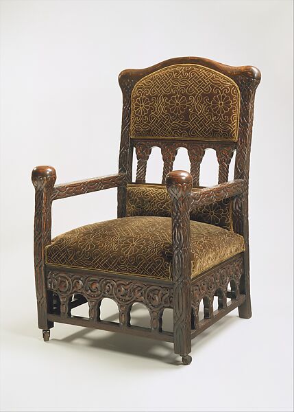 This unusual armchair is one of two that survive from H. O. Havemeyer's library, also called the Rembrandt Room. The Havemeyer house at 1 East 66th Street, New York City, completed in 1892, was a uniquely conceived home. Tiffany and Colman incorporated numerous exotic influences in these interiors, including Japanese, Chinese, Moorish, Viking, Celtic, and Byzantine. The prevailing theme of the room was derived from Celtic, Viking, and other medieval sources, echoed in the low-relief carved ornament and embroidered designs on the chair. As Mrs. Havemeyer recalled in her memoirs, the covering of different shades of smooth olive green plush was "quilted with various colored silks, also in a Celtic design to correspond to the carvings of the woodwork and chairs."