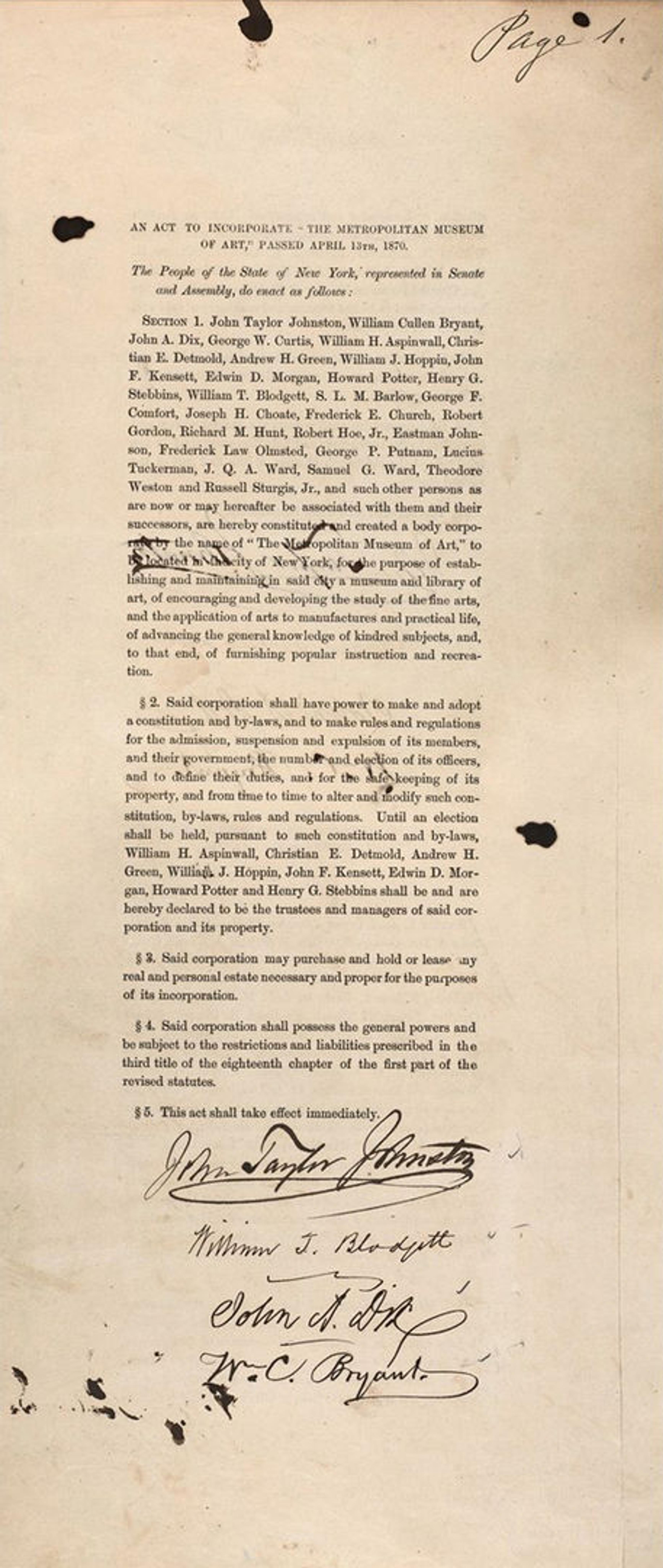 One hundred forty years ago today, on April 13, 1870, the Legislature of the State of New York granted an act of incorporation that formally established The Metropolitan Museum of Art. The new institution was charged with "encouraging and developing the study of the fine arts, and the application of the arts to manufacture and practical life, of advancing general knowledge of kindred subjects, and, to that end, furnishing popular instruction and recreation. (Charter of The Metropolitan Museum of Art, State of New York, Laws of 1870, Chapter 197, passed April 13, 1870 and amended L. 1898, ch. 34; L. 1908, ch. 219.)