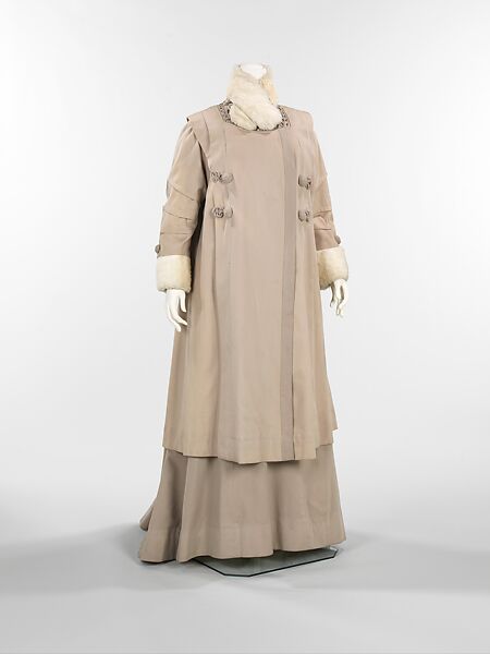 Thurn was a respected New York dressmaking firm during the Belle Époque which collaborated with French couturiers. This is a beautiful ensemble that shows the complexity of characteristics of the period, seen in the embroidery on the velvet of the dress and the embroidery on the wool of the coat.