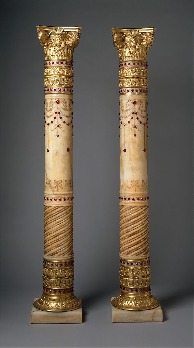 Herter Brothers, the leading cabinetmaking, design, and decorating firm during the second half of the nineteenth century, created a pair (2002.298.1-.2) of opulent pedestals for their most prestigious commission, the grand Fifth Avenue residence of William H. Vanderbilt. Each pedstal is a column carved with ribbons and "jewel"-encrusted garlands. Ormolu capitals incorporate classical female masks and birds' heads; decorative mounts feature stylized foliate patterns. They were intended as an integral part of the ornate decoration of Vanderbilt's drawing room, described in 1883–84, shortly after its completion, as "gorgeous in the extreme: everything sparkles and flashes with gold and color—with mother-of-pearl, with marbles, with jewel-effects in glass—and almost every surface is covered, one might say weighted, with ornament." These onyx columns or pedestals, "hung with gold chains set with colored cut crystals," contributed to this impression. Their carved and gilded decorative motifs—tied bowknots and necklaces strung with jewelry—are repeated in decorations throughout the house. Lighting fixtures in the form of vases originally stood upon them, adding their own luster to the composition.