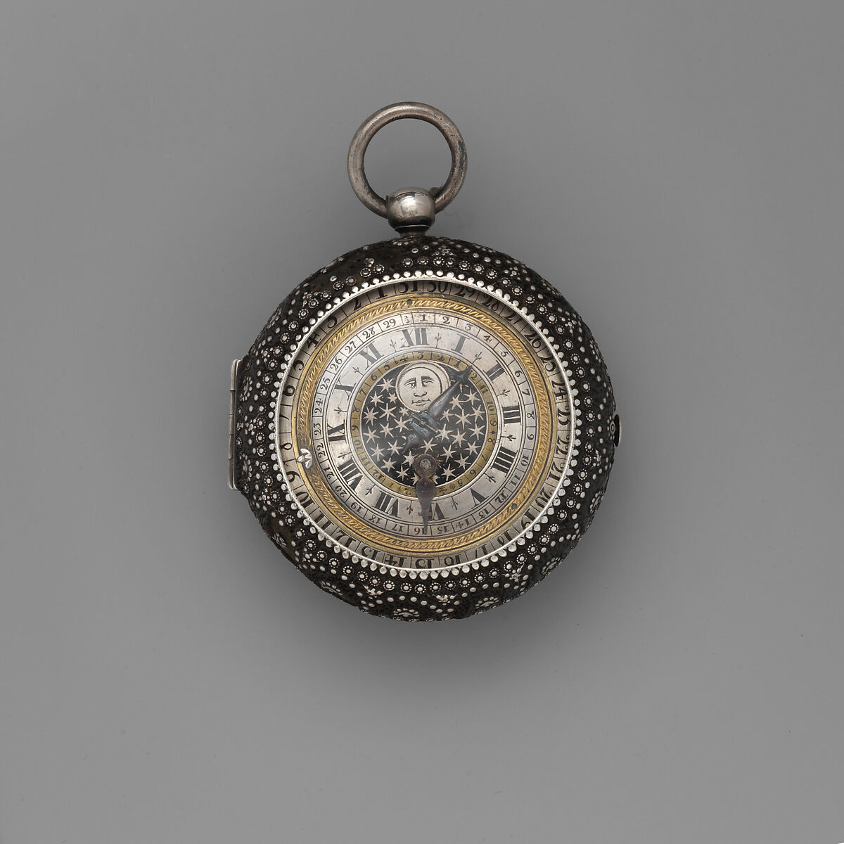 The concentric chapter rings of this unusual dial indicate the time of tides (presumably at London Bridge), mean solar time (I-XII), the age of the moon in its monthly cycle (1-29 1/2), and the day of the month (1-31). The moon's phases can be read though the circular aperture in the center disk. The February 1661 issue of Kingdoms Intelligencer, a newspaper published by the English parliament in opposition to the king, reported the loss of a comparable watch by Alcock.
