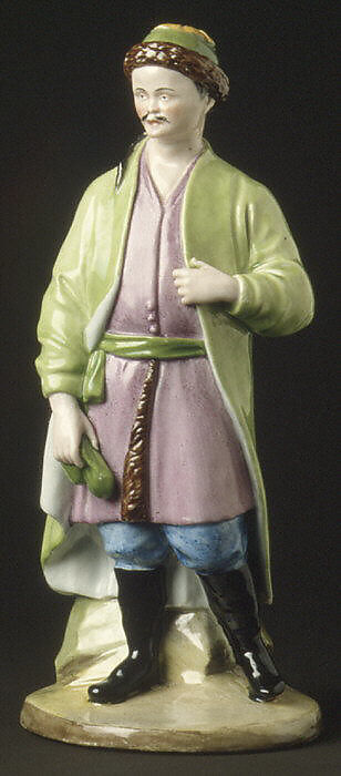 About 1780 the Imperial factory began the production of a large series of figures depicting Russian national types, of which fourteen are represented in the Linsky Collection. Like most of the figures, this figure is modeled from engravings published by Johann Gottlieb Georghi in his Description if All the Peoples Inhabiting the Russian State (editions of 1774, 1776, and later). The authorship of the models themselves is not established, but some may be attributable to Jean-Dominique Rachette (1744–1809), chief modeler at the factory from 1779 to 1804.