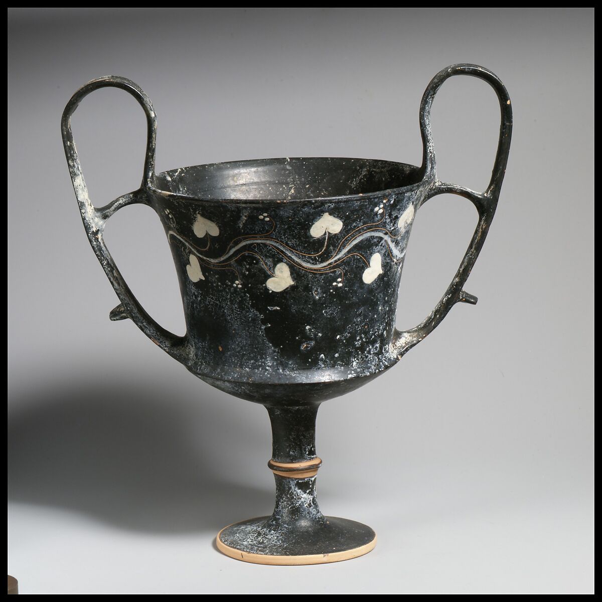 The upper half of the cup is decorated by a vine- leaves and korymboi- executed in incision and added white paint.