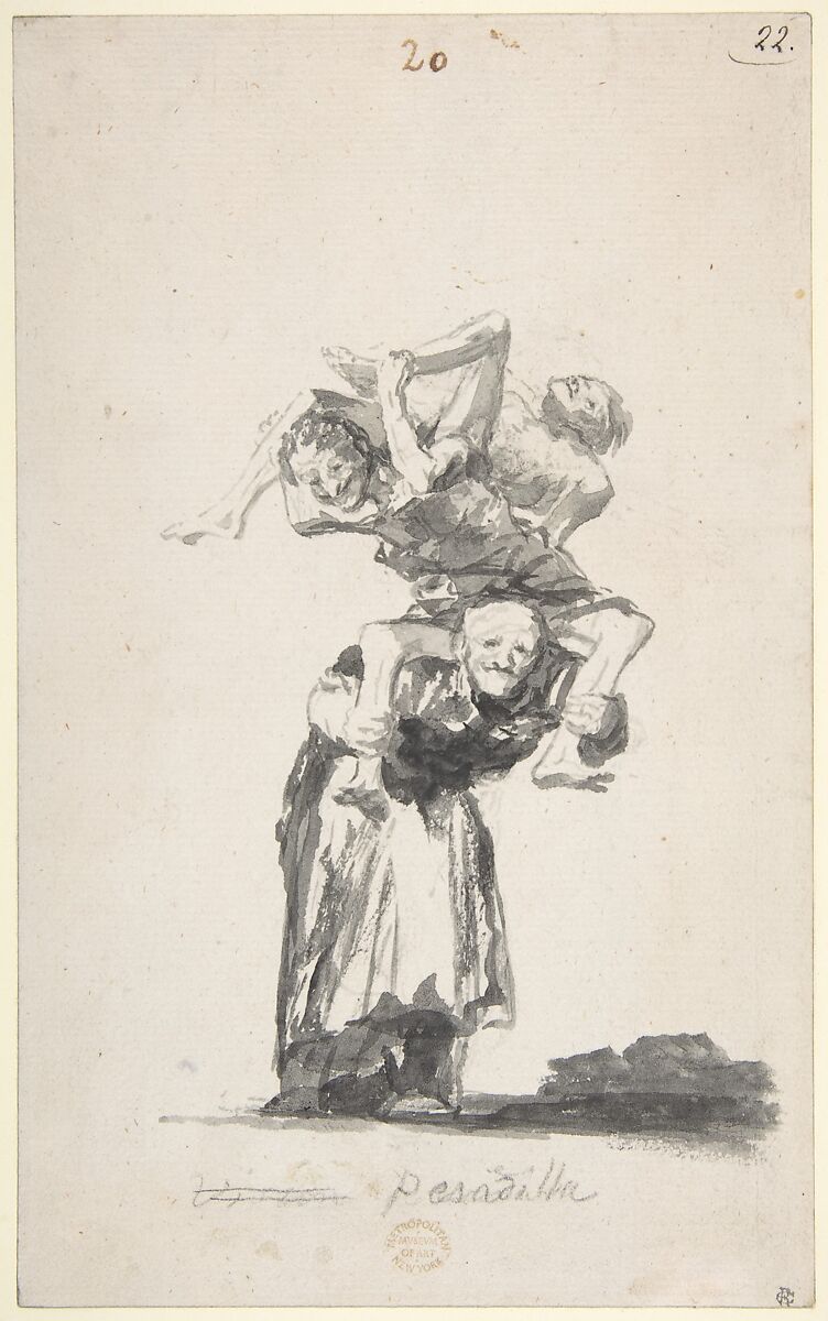 In this drawing, Goya crossed out the original caption "visión" and replaced it with "pesadilla" (nightmare), possibly as a pun on the origins of the term pesadilla in pesada, meaning the act of weighing. The revised caption might reference the heavy burden of the grinning old woman, who carries on her back two emaciated men in varying states of undress. Alternatively, the caption might suggest two further meanings of pesada, now obsolete: the oppression of the heart and difficulty in breathing during sleep, and an anguishing, persistent dream. Perhaps it is simply meant to echo the uneasiness of the vision.