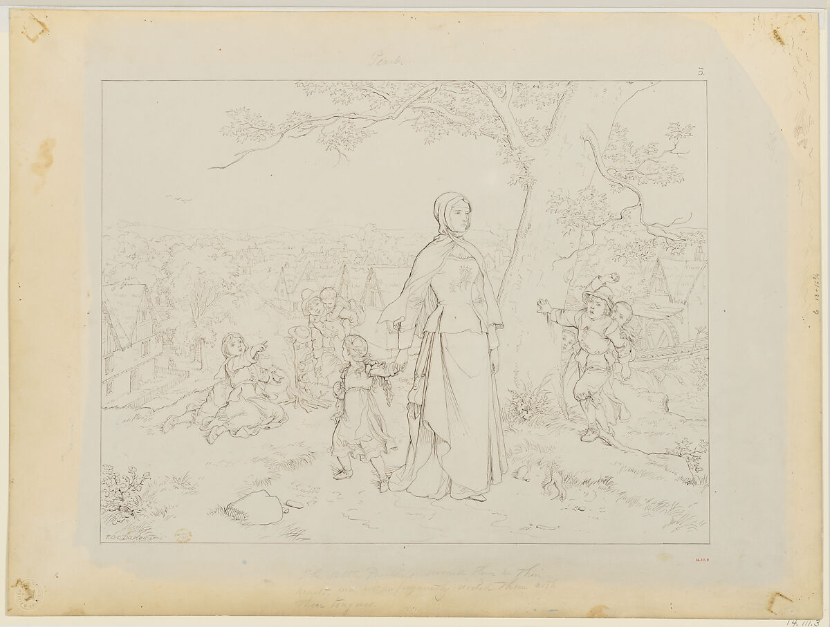 Darley illustrates Hawthorne's "The Scarlet Letter, A Romance" (published 1850). His drawing was reproduced in 1879 as the third print of twelve "Compositions in Outline." Set in seventeenth-century Boston, the story explores the consequences of a liason between Hester Prynne and the Puritan pastor Arthur Dimmesdale. When Hester becomes pregnant, she refuses to identify her child's father, is imprisoned, and forced to wear a red letter "A" on her dress (to mark her as an adultress). Upon release, she lives in an isolated cottage and supports herself as a seamstress while raising her daughter Pearl. This image responds to text in chapter 6 which decries the cruelty of local children towards the girl who, like her mother, is shunned by the community. As Hester leads her daughter away from town, they endure verbal abuse and physical threat–one girl holds and prepares to throw a stone. See 14.111.1,.2,.4.,.5 for other drawings from the set.