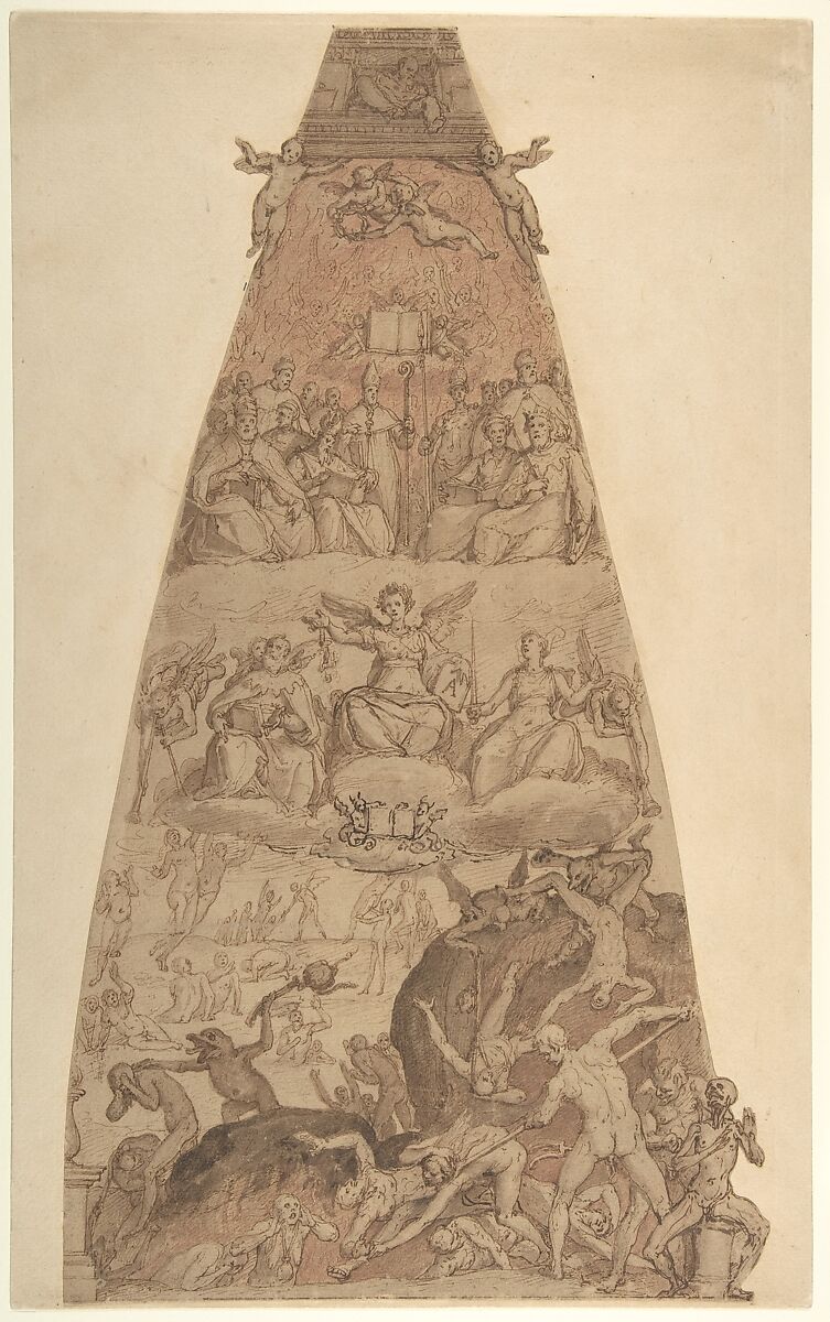 Carefully executed by Federico Zuccaro in preparation of his frescoes for the monumental dome of the Florence Cathedral (1574-79), this drawing corresponds, with certain variations, to the third segment of the octagonal cupola to the right of the principal segment - where the Judging Christ is represented. Raffaello Borghini in his account ‘Il Riposo’ (Florence, 1584) extensively discussed the program for the frescoes on the dome, and praised Zuccaro for his "invenzione" (creativity and invention) of the scheme. The present drawing is strictly related to a very coherent group of sheets realized by Zuccaro in preparation of the dome’s decoration now held in Amsterdam, Paris, Vienna, Chicago, Florence and Darmstadt. Like the present sheet, several of these drawings have been cut down to the shape of the segment of the cupola. Zuccaro may have cut the drawings together to make a small tridimensional model of his project.