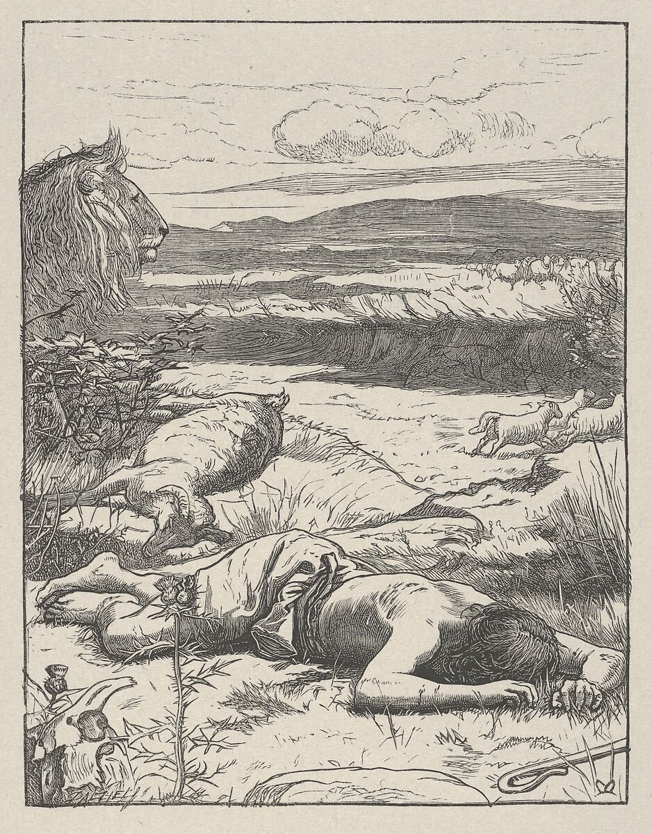 The Parable of the Good Shepherd appears in John 10:11-14 and tells of a man willing to lay down his life to protect his sheep. Pre-Raphaelite ideals shaped the combination of detailed naturalism and down-to-earth imagery to produce a work distinctly different than most religious art of the period.