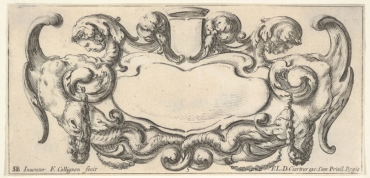 - Title: Plate 5: a cartouche with a blank escutcheon at top center, a chimera to either side, their bodies ending in scrollwork and dragon tails, from "Twelve cartouches" (Recueil de douze cartouches)