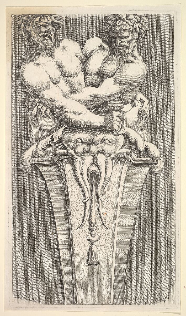 - Title: Design for a Term with Two Bacchic Figures, from: Curieuses recherches de plusieurs beaus morceaus d'ornemens antiques et modernes (...)