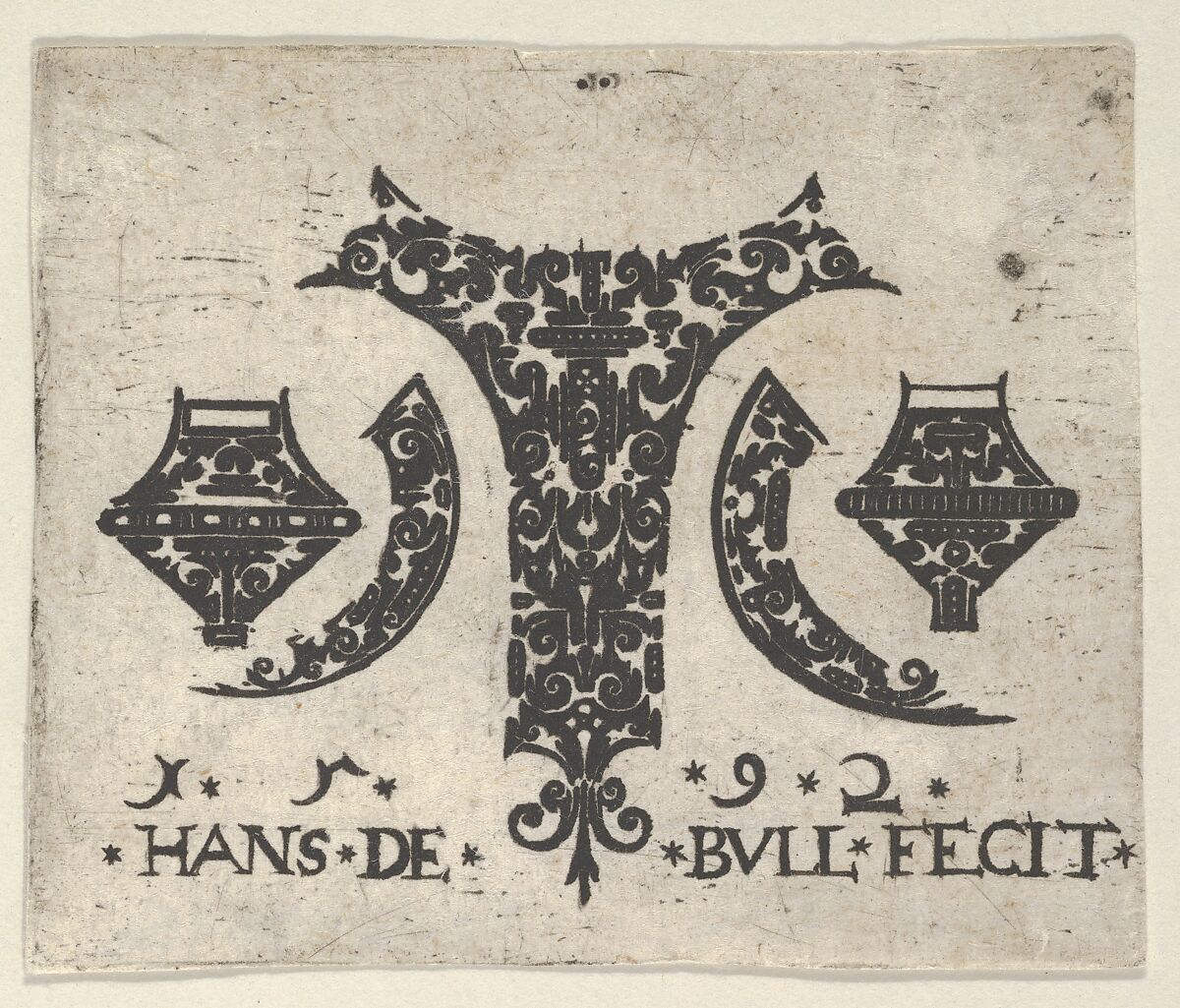 Small blackwork print with a large central bezel with Schweifwerk, flanked by two outward-facing, lunar-shaped motifs and two smaller bezels.
