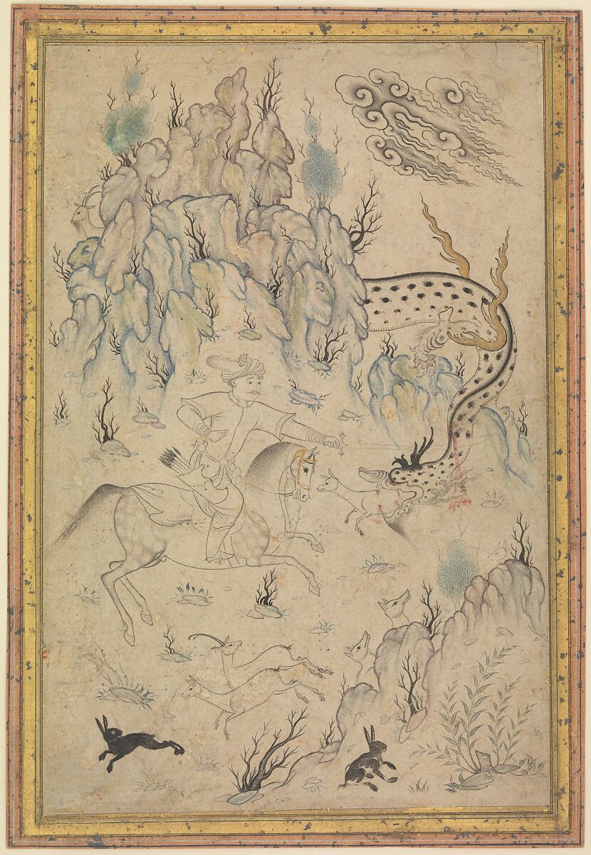 In a rocky landscape a hunter on horseback plunges his sword through the neck of a dragon that has sunk its fangs into a small deer. A pair of deer and two rabbits scatter in the foreground. With its blue tinted rocks and gold dragon's wings, this is a finished drawing, despite the narrative suggestion of its subject matter. Various heroes in the 'Shahnama', the Persian national epic, combat dragons, but this image evokes rather than illustrates these manly acts.