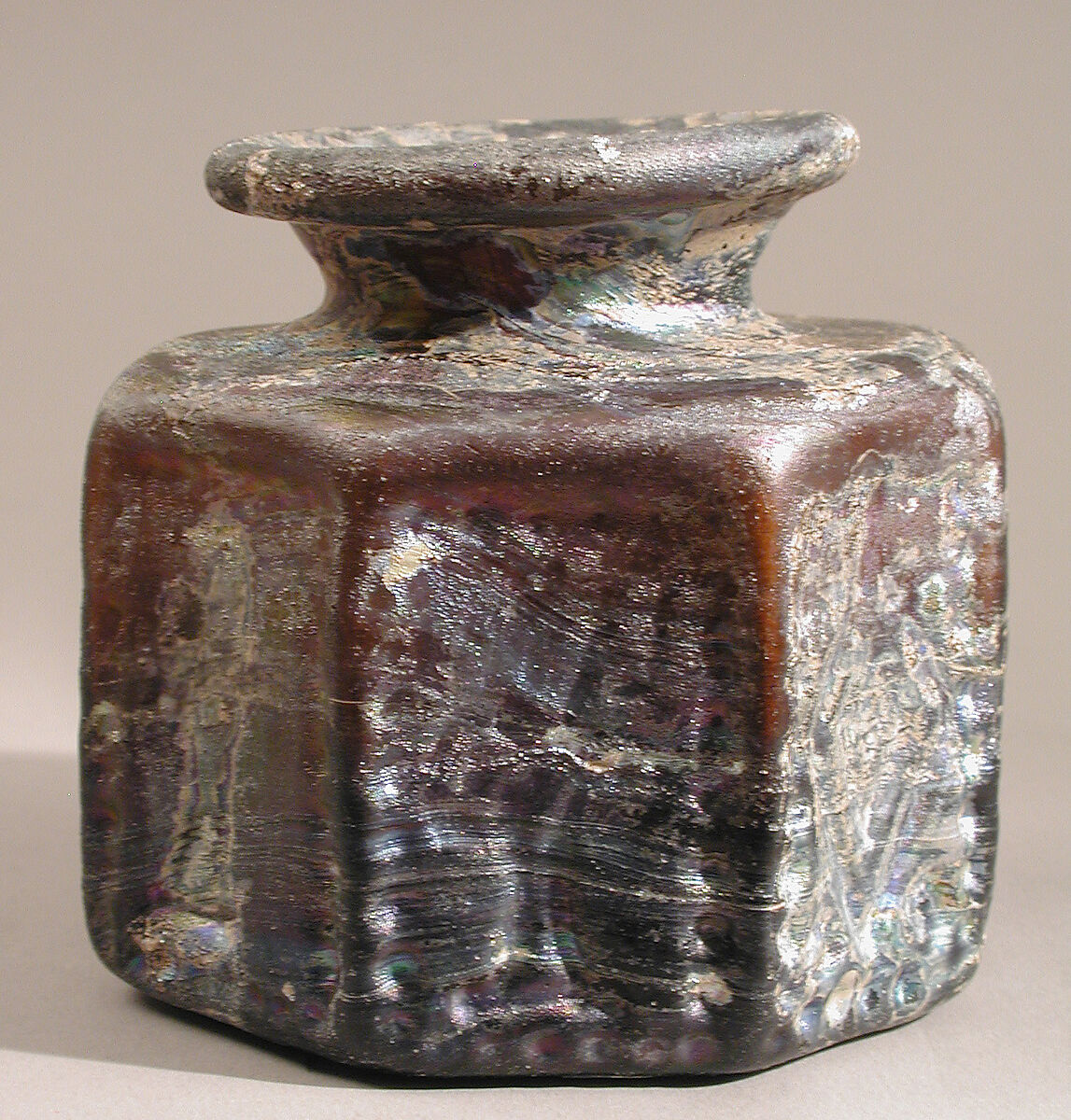 These vessels were made for Jews and Christians, possibly as tokens for pilgrims visiting the holy sites in Jerusalem or for use in burial rites. They appear to have been mass-produced in a single workshop, since the vessels for the two religions closely resemble each other in shape and style and differ only in the symbols decorating them. The Jewish vessels depict the menorah (candelabrum), shofar (ram’s horn), incense shovel, and lulav (palm branch). The Christian vessels are decorated with several types of crosses. The relief designs were produced by blowing molten glass into a mold.