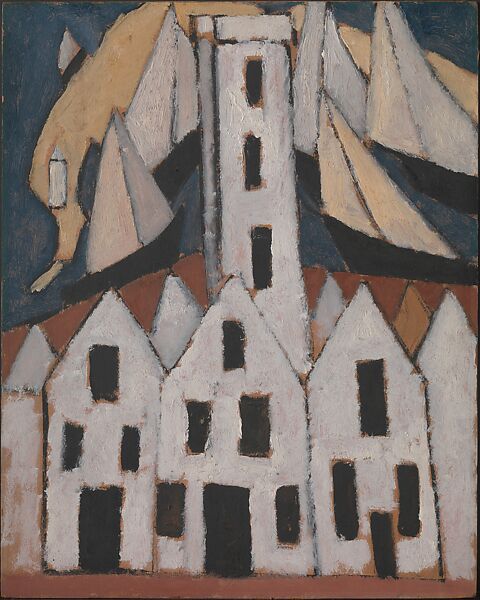 Hartley spent a productive summer in 1916 in the company of Charles Demuth and Eugene O'Neill in Provincetown, Massachusetts. The Cape Cod resort was a favorite spot for artists, writers, and actors. Within this small format, several houses, sailboats, and the tall Pilgrim Monument are compressed into flat, geometric forms. Hartley's titles from the 1910s, such as Movement, Symphony, and Arrangement —like those first used by Whistler, suggest musical analogies for visual imagery.