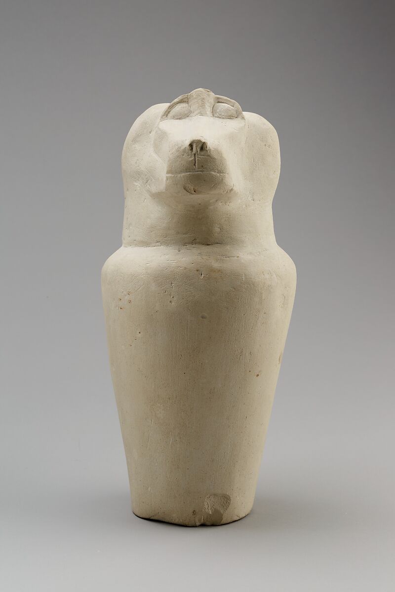 This dummy jar has no interior cavity and the "lid" is not removable. It dates to a period during which the internal organs were mummified and then placed back into the mummy, but canopic jars continued to be included as part of the burial equipment in order to ensure the protection of the four Sons of Horus.