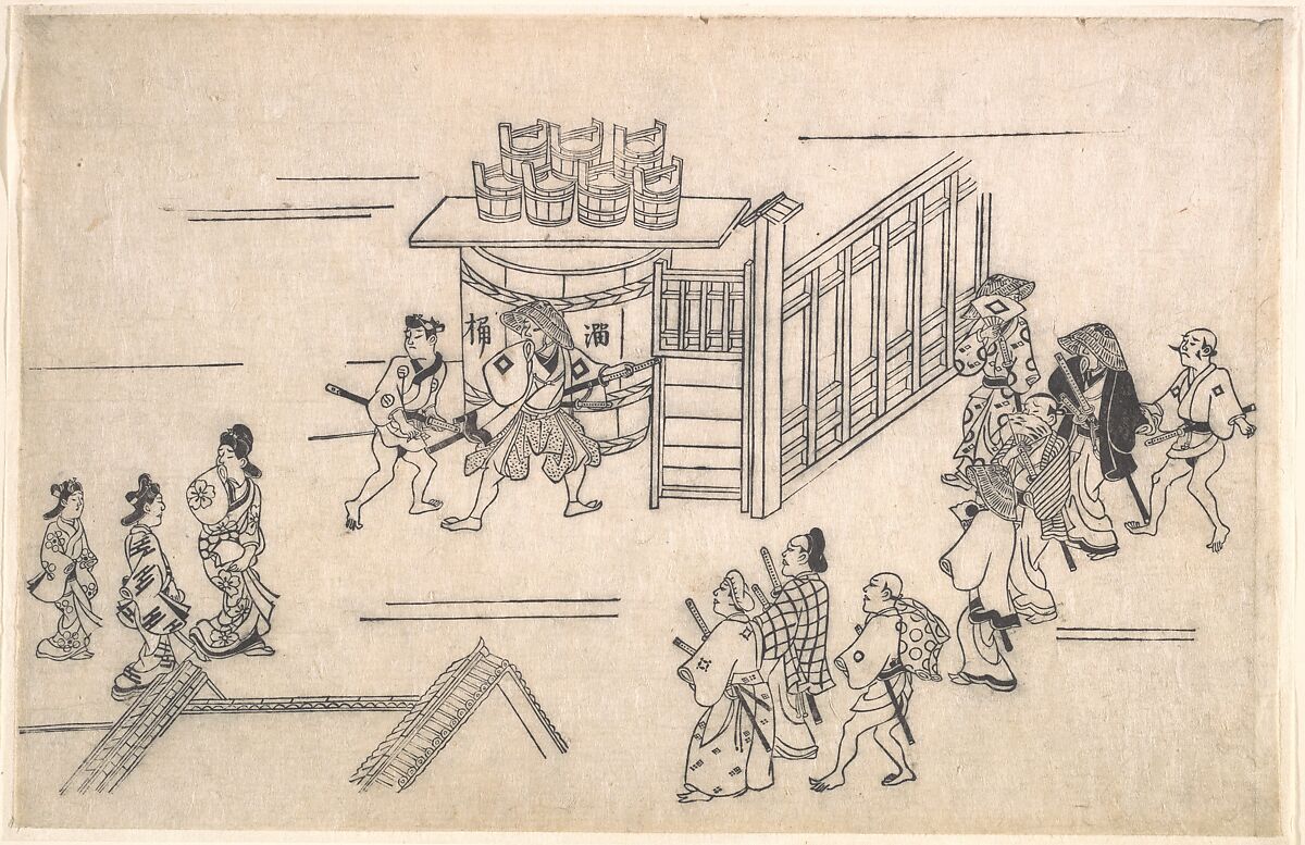 In this Yoshiwara street scene, the three women at the left are the center of attention. The water tank and buckets in the background are at the ready in case of fire in the narrow, crowded streets of the pleasure quarter. Yoshiwara burned down completely in 1676, just a few years before this print was made.