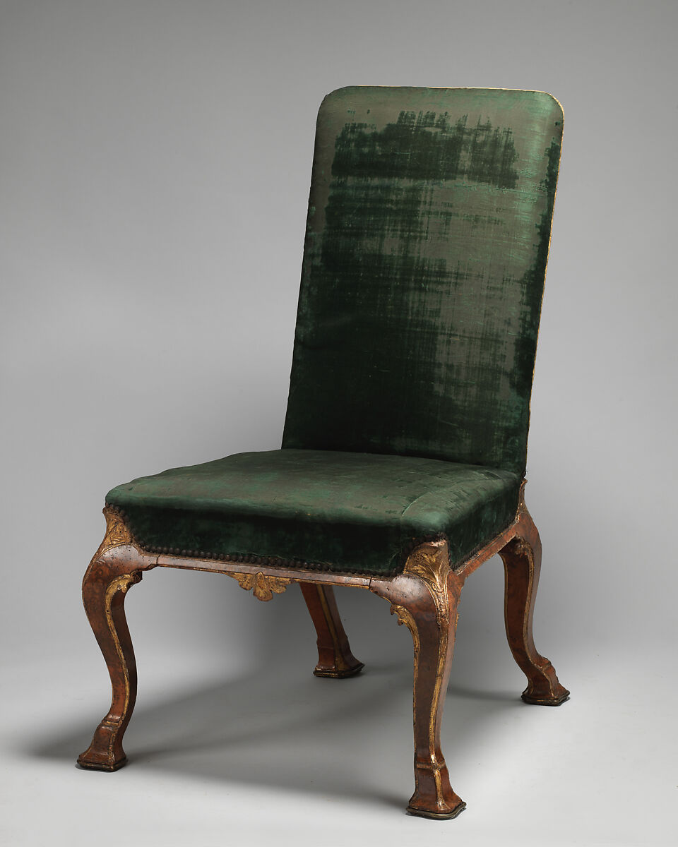 - Medium: Beech and oak veneered with burl walnut, parcel-gilt; covered in silk velvet