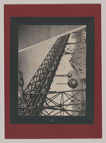 - Medium: Cut and pasted printed papers, black masking tape on paperboard with dark red facing paper