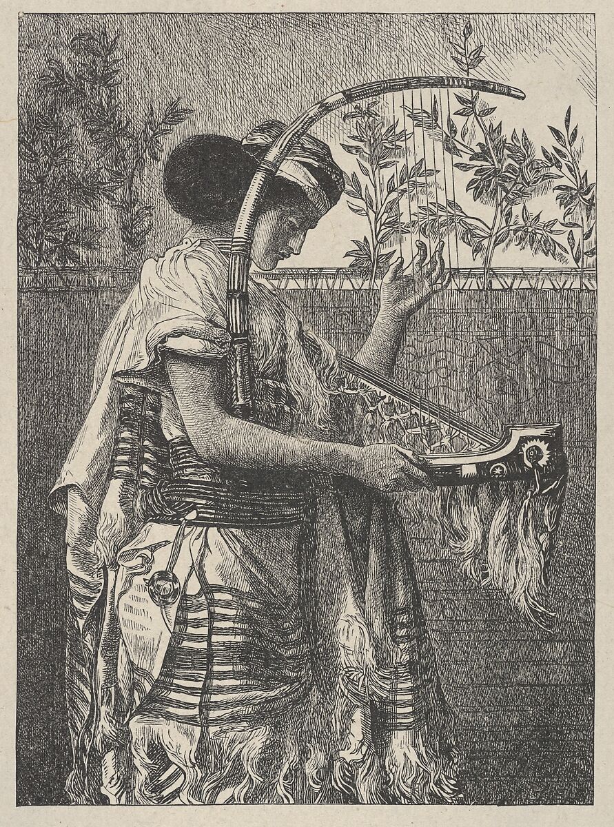 In 1862 the Dalziel Brothers, prominent Victorian wood engravers, approached a group of British artists with plans for a lavishly illustrated Bible. Work began immediately, but the sixty-seven prints of Old Testament themes were not published until 1881. Solomon came from a prominent Jewish family and intended his six designs to celebrate his heritage. Hosannah! shows a temple musician during the Feast of Tabernacles and was inspired by a line in Psalm 149, "Praise for God’s goodness to Israel." Solomon admired Dante Gabriel Rossetti and Edward Burne-Jones, and this early work places him in Pre-Raphaelitism’s second wave.