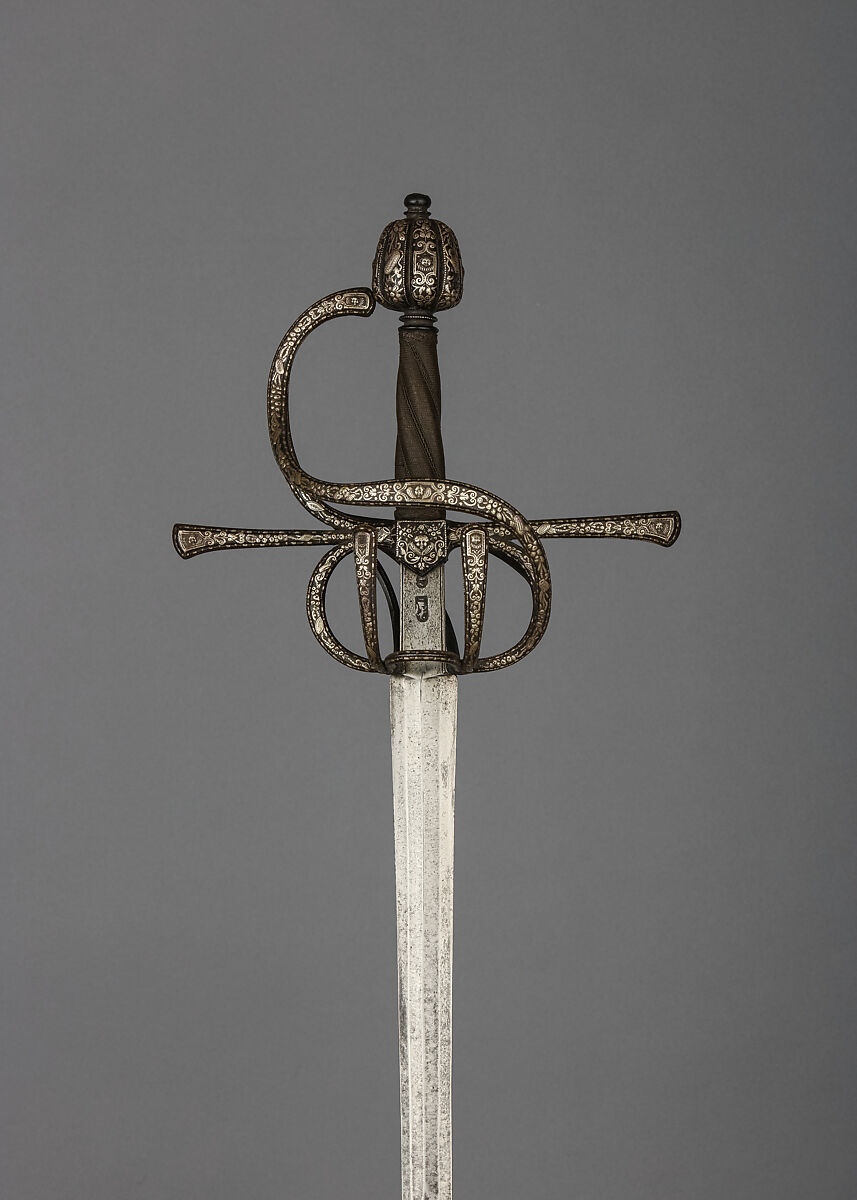 The rapier was the principal civilian sidearm throughout the sixteenth and seventeenth centuries. Designed for cut-and-thrust fencing of progressively complex techniques, the rapier is characterized by a double-edged blade with an acute point and an elaborate guard for the hand. The guards, usually of iron or steel, were subject to a variety of embellishment. They were engraved, chiseled, gilded, damascened, and encrusted in gold and silver in keeping with fashionable styles.