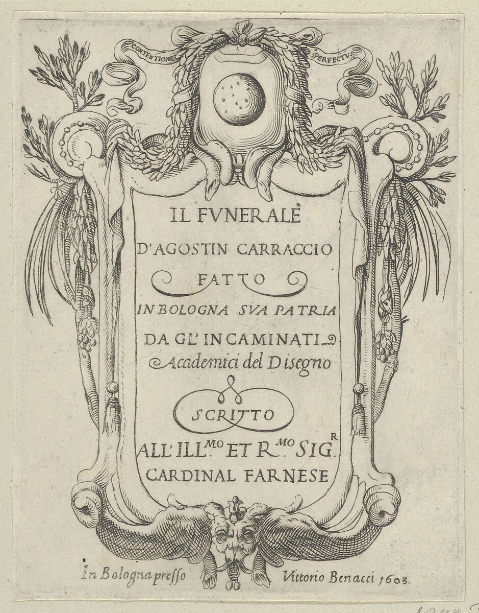- Title: Title page to IL FUNERALE D'AGOSTIN CARRACCIO FATTO IN BOLOGNA SUA PATRIA DAGL'INCAMINATI Academici del Disegno; title inside a cartouche with a globe and stars at top and a grotesque mask at bottom