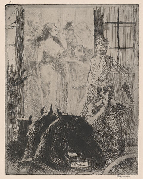 This etching portrays the triumph of the elegant and beautiful woman who, after some months, becomes known as "the most beautiful woman in Paris". She appears here under electric lamps, leaving one of many soirées she attends. The master of the house bows down and kisses her hand while a valet searches for her jacket.